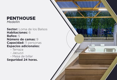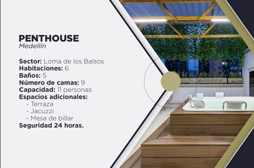 Lujoso Penthouse para 11 personas Ubicado en el exclusivo sector de Loma de los Balsos, Medellín. Cuenta con 6 habitaciones, 5 baños y 9 camas, ideal para grupos grandes. Disfruta de espacios premium como terraza, jacuzzi y mesa de billar, con la tranquilidad de seguridad las 24 horas.