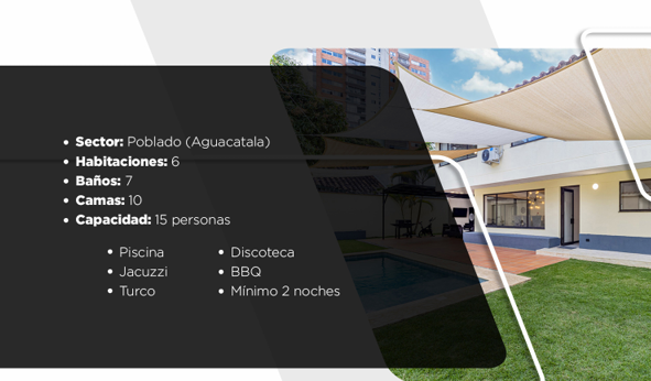 Increíble Casa en El Poblado (Aguacatala) Espaciosa propiedad para 15 personas con 6 habitaciones, 7 baños y 10 camas. Diseñada para el entretenimiento, cuenta con piscina, jacuzzi, turco, BBQ y discoteca privada.